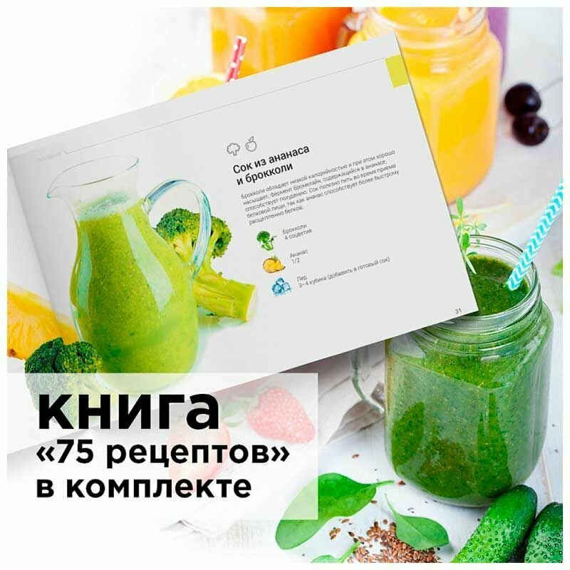 Juicer, cleaning brush, juice glass, pulp glass, instruction manual, service book, recipe book