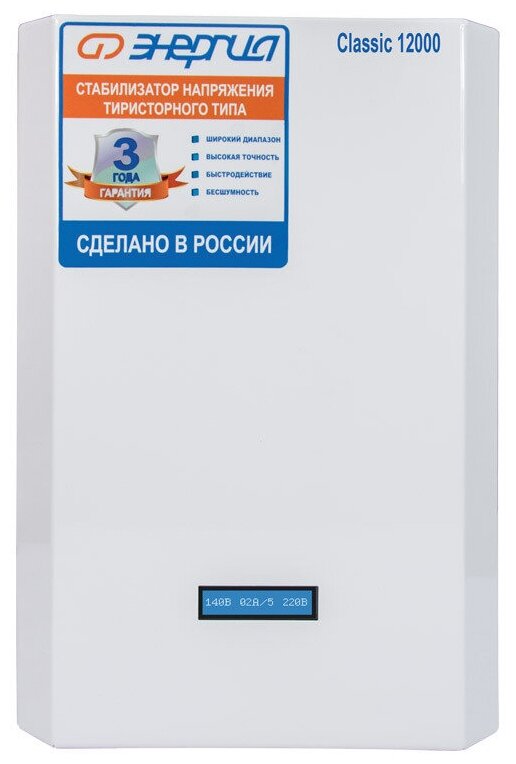 Input voltage type: single-phase, stabilizer type: electronic thyristor, placement: floor, wall, universal, min. input operating voltage: 125 V, accuracy: 5%, noise level: 56 dB