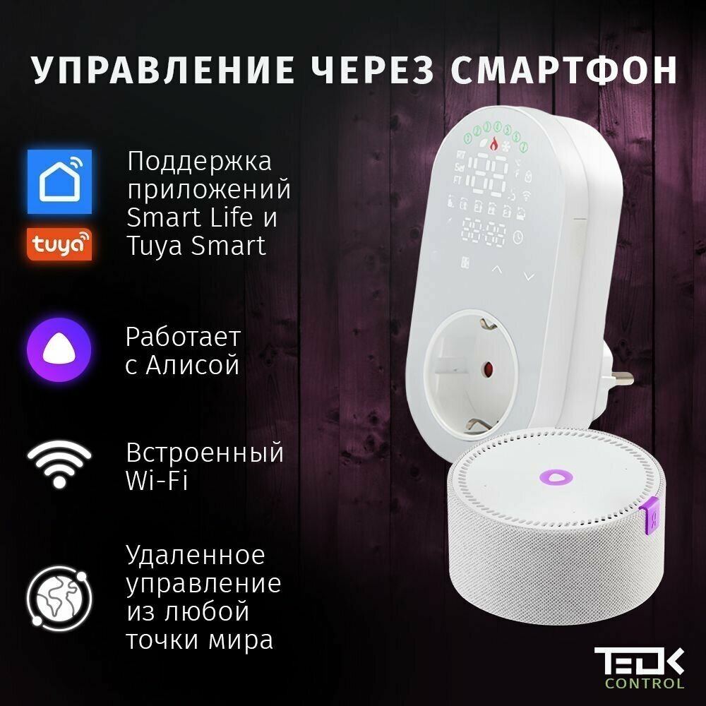 Control type: touch, maximum load: 3500 W, minimum temperature: 5 °C, maximum temperature: 90 °C, connection to a smartphone, air temperature control, floor heating temperature control,