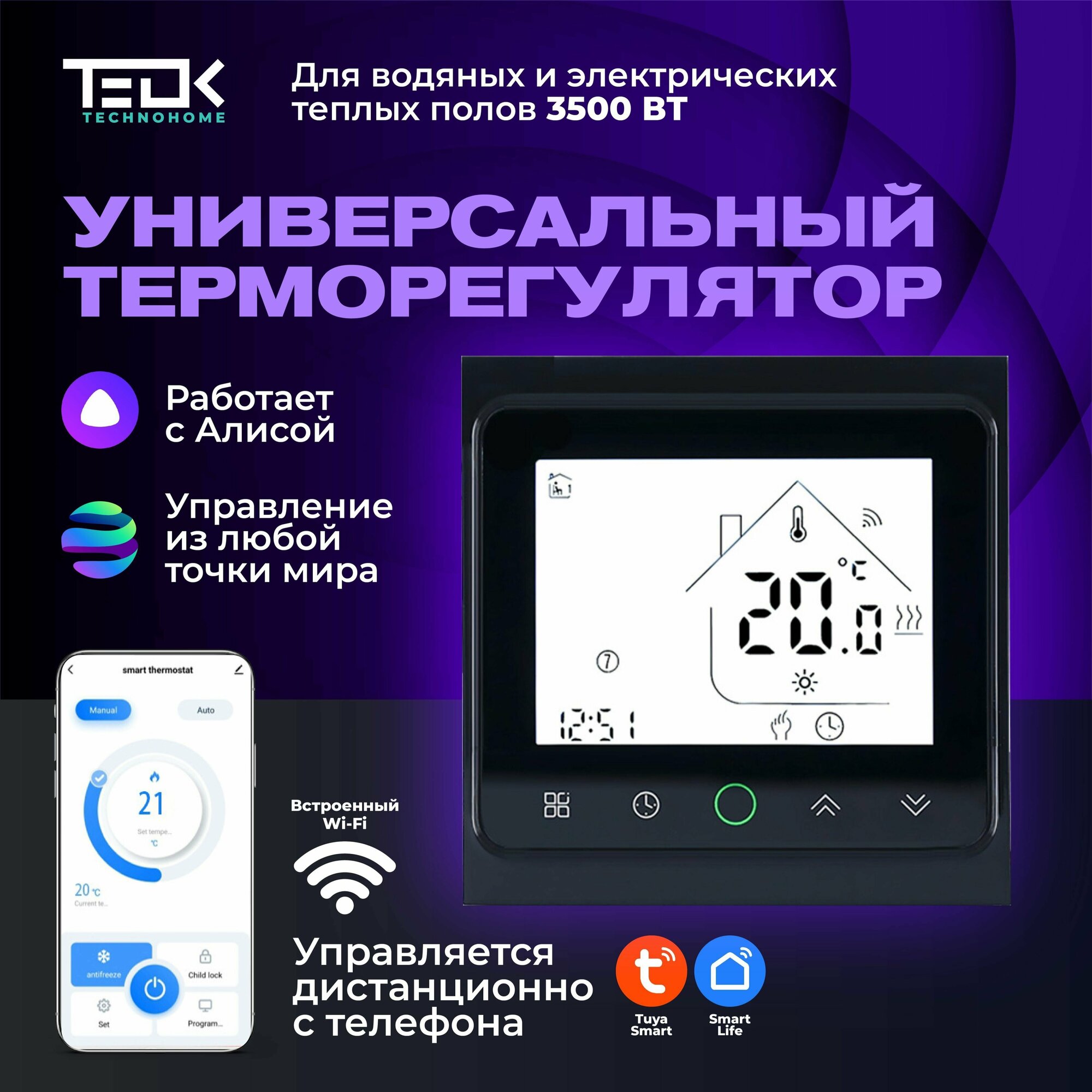 Control type: touch, maximum load: 3500 W, minimum temperature: 5 °C, maximum temperature: 90 °C, connection to a smartphone, air temperature control, floor heating temperature control,