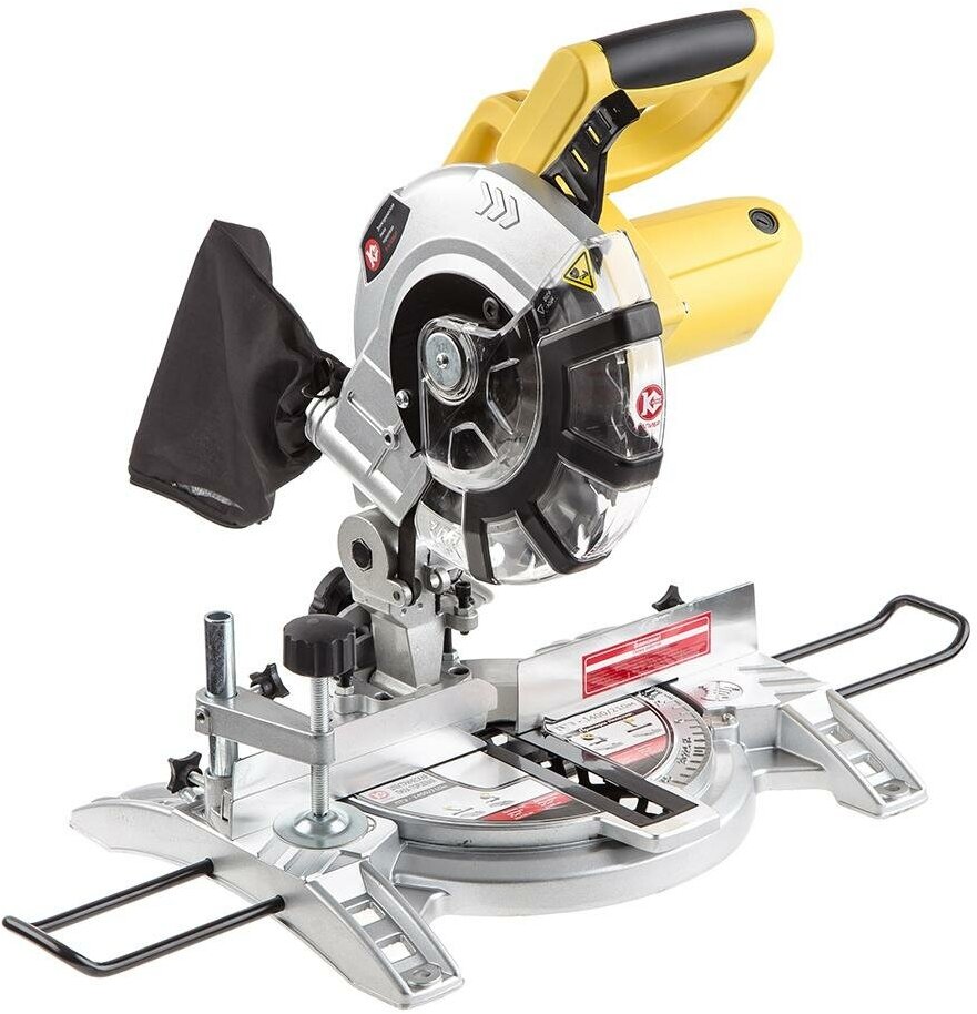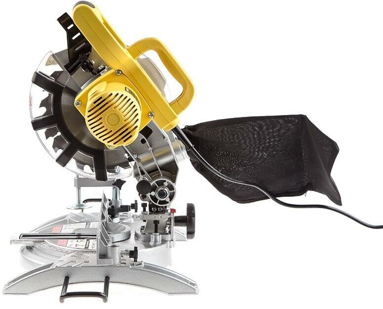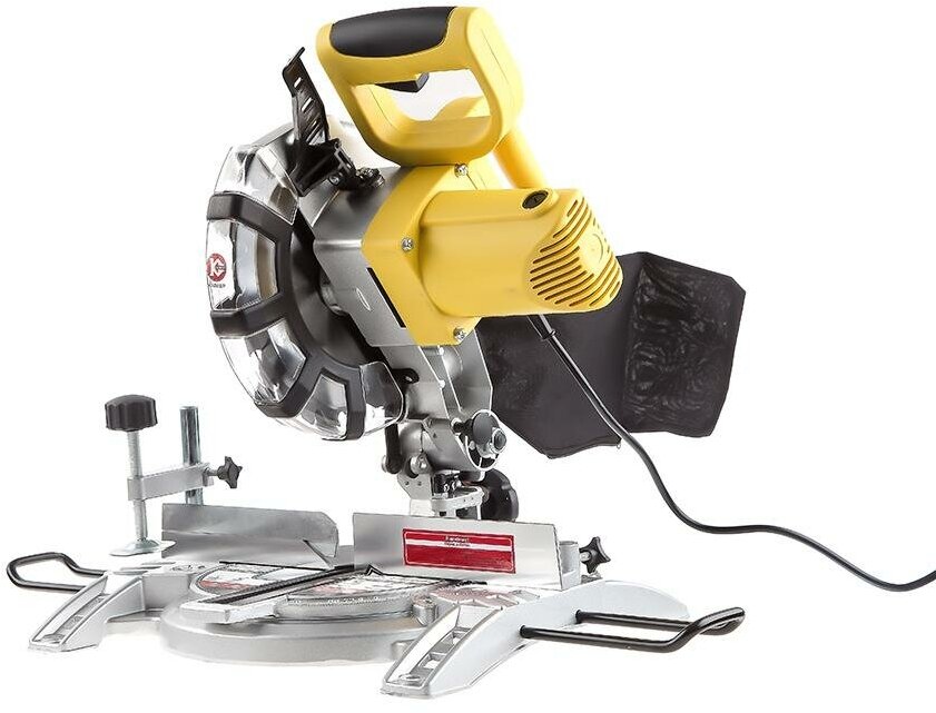 Electric miter saw; Wood saw blade; Vertical clamp clamp; Disc mounting key; 2 graphite brushes; Dust collector; 2 additional supports; Manual; Package.