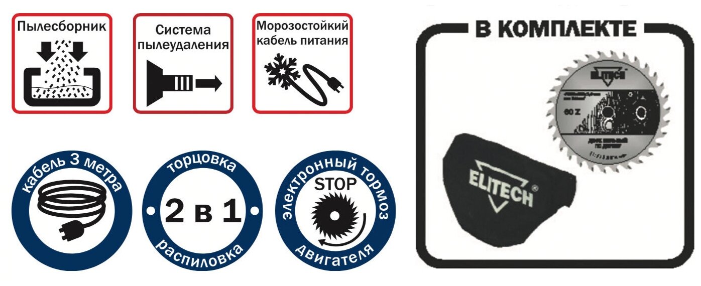 Contents of delivery: Carbide disc for wood; Protective cover of the saw blade; Turntable with 45°/45° swivel markings; Clamp for standard cutting angles; Package.