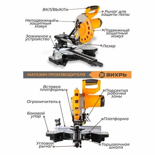 Type: miter saw, laser marker, disc diameter: 216 mm, Power W: 1500, cutting depth 90°: 65 mm, cutting width 90°: 305 mm, with pull, power supply: from the mains, design features: the ability to connect a vacuum cleaner, laser �