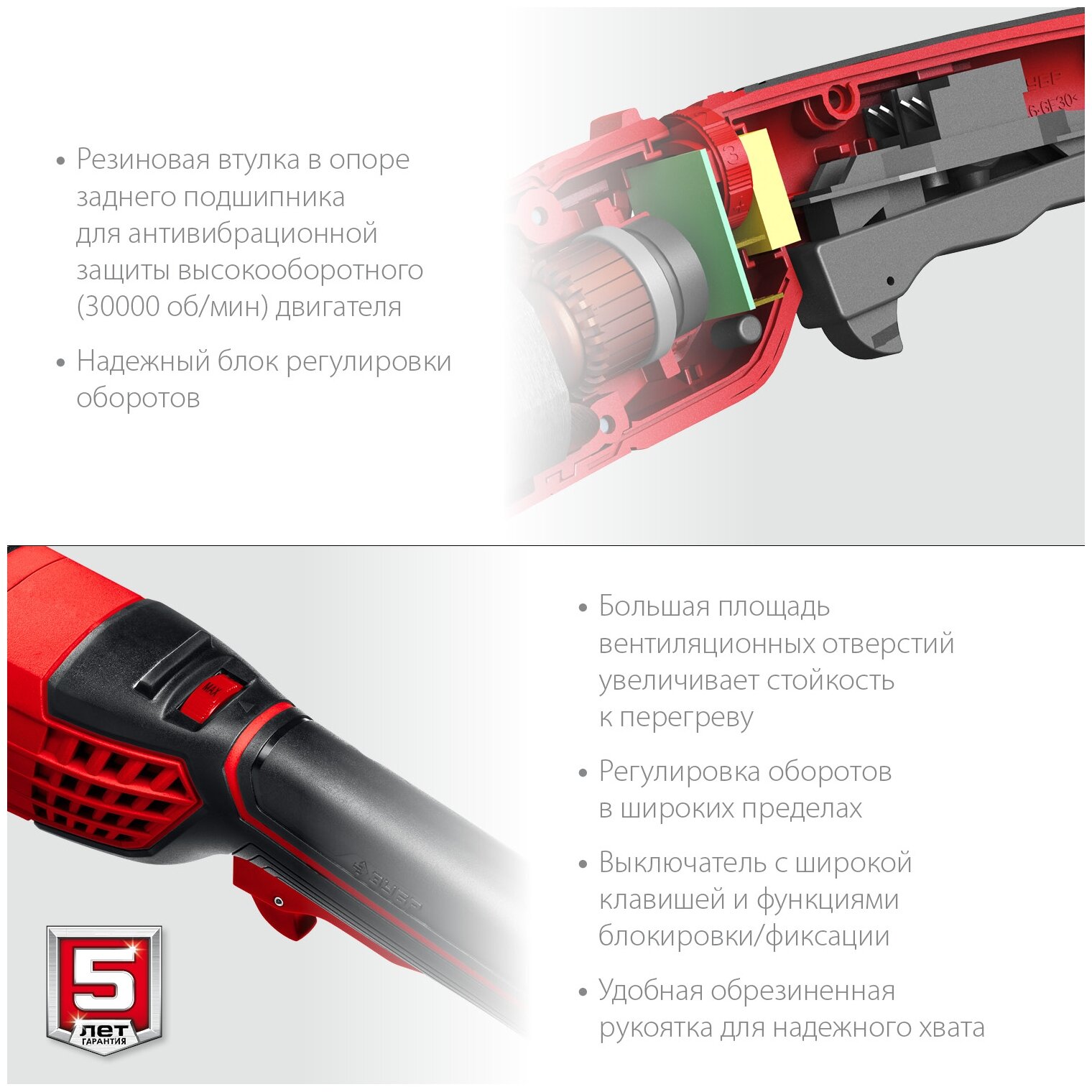 Power button lock, two-handed, additional handle, dust collector, spindle fixation, Replacement of brushes without disassembly, Protective cover, Rubber-coated handles, Superflange