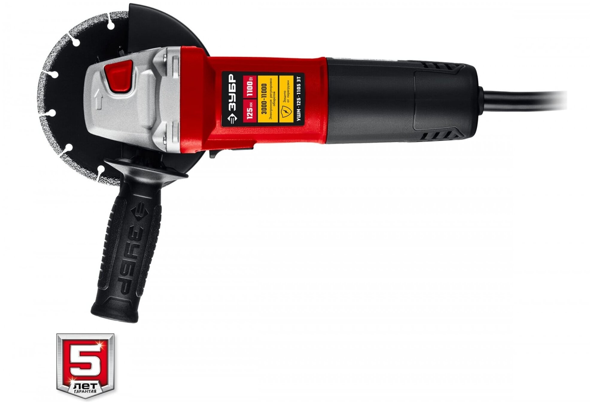 Power type: mains, max. disc diameter: 125 mm, design features: power button lock, two-handed, additional handle, spindle lock, Protective cover, Rubber-coated handles, Superflange,