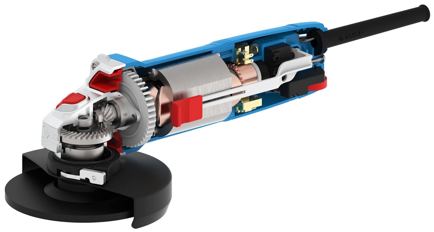 Power button lock, additional handle, tool-free adjustment of the housing, Instant brush replacement, Protective cover, Rubber-coated handles, Superflange