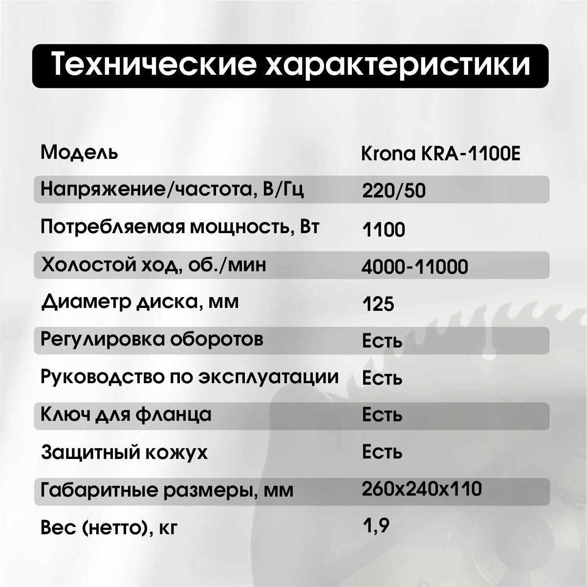 Type of power supply: mains, max. disc diameter: 125 mm, design features: power button lock, additional handle, spindle lock, power consumption: 1450 W, max. disk speed: 11000 rpm, weight