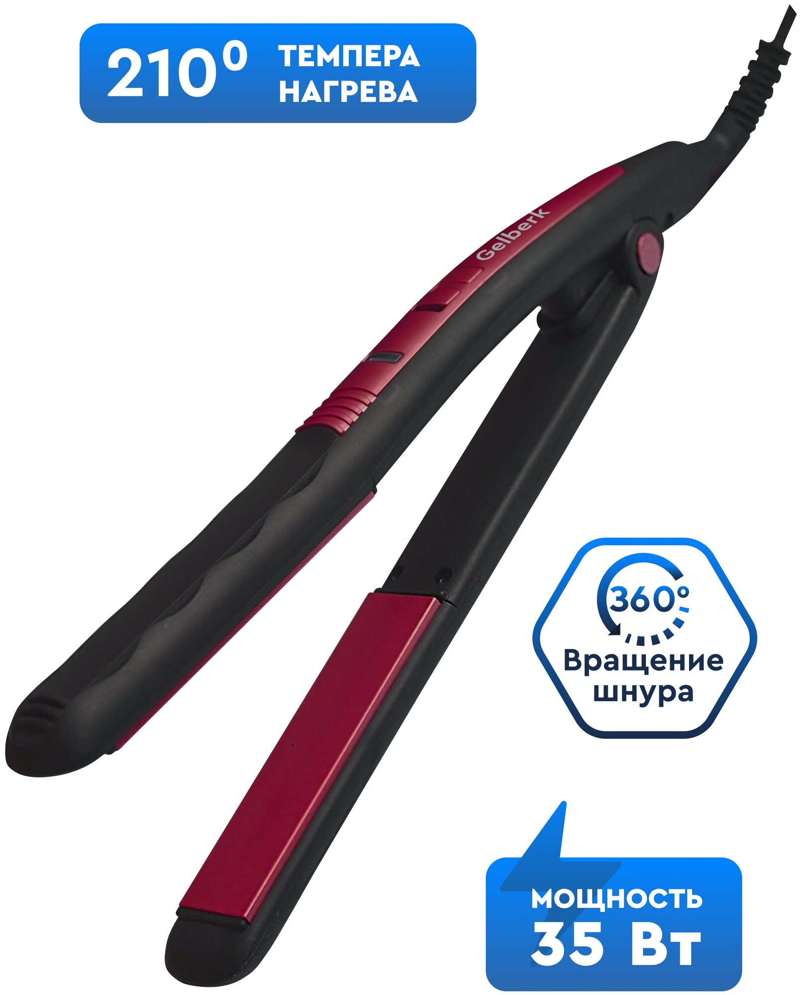 Type: straightener, coating: ceramic, type of curling iron: curling iron, purpose: straightening, curling, plate width: 25 mm, maximum heating temperature: 210 °C, number of heating modes: 1, power: 35 W, features: rotating