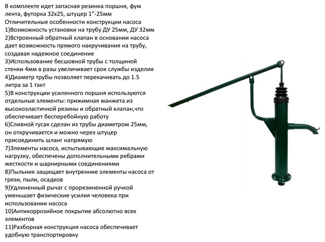The pipe diameter allows you to pump up to 1.5 liters per stroke; extended lever with rubberized handle; anti-corrosion coating