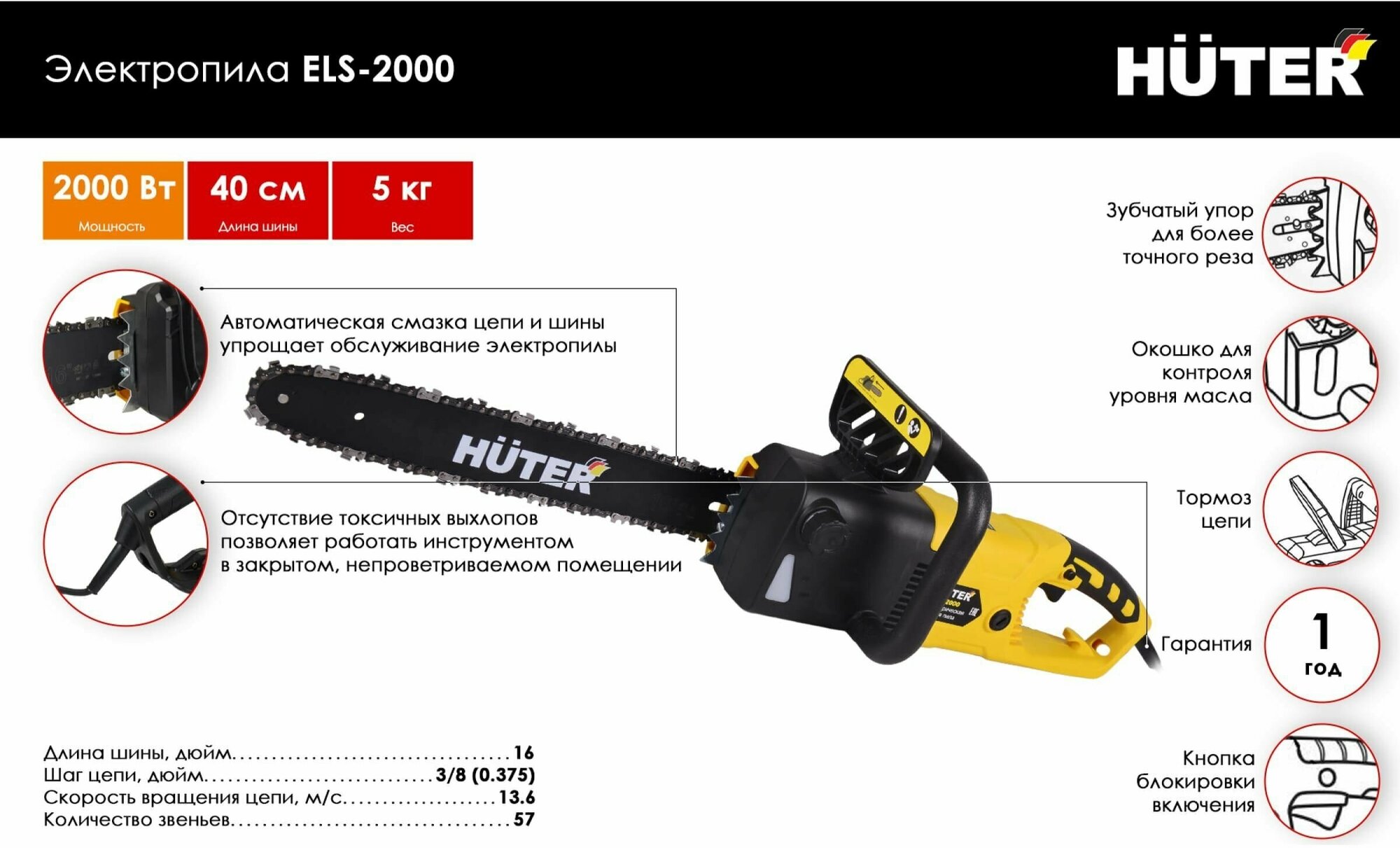 Power type: mains, bus length: 40 cm, power W: 2000 W, hp power: 2.70 hp, weight: 5.90 kg, chain pitch: 3/8 inch, functions: soft start, motor brake , chain brake