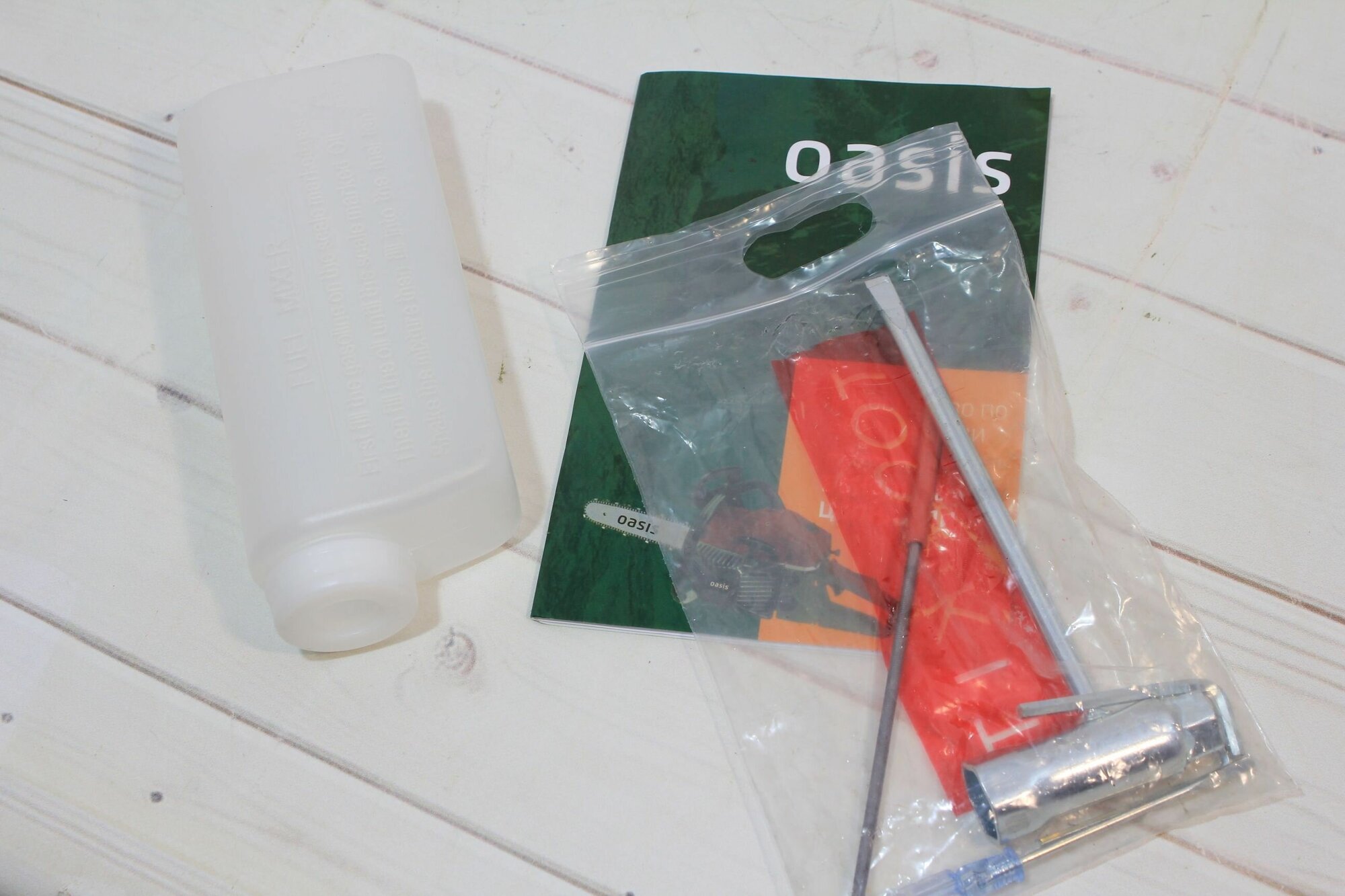 Petrol saw, guide bar, bar guard, saw chain, assembly tool, mixing container