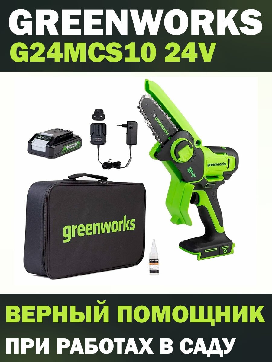 Mini-chain / cordless lopper Greenworks G24MCS10 24V, tire length 10 cm, battery kit 2 Ah + charger