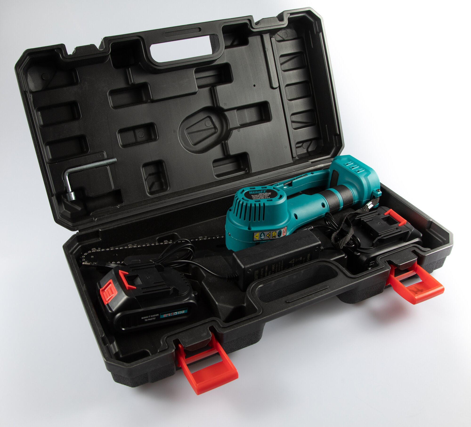 Saw, two batteries, case, charger, chain tensioning tool and 100g tube of chain oil,