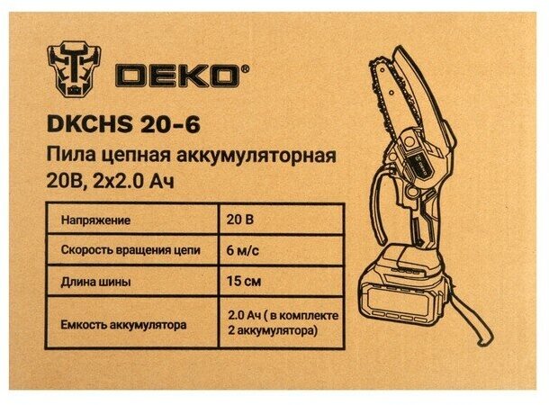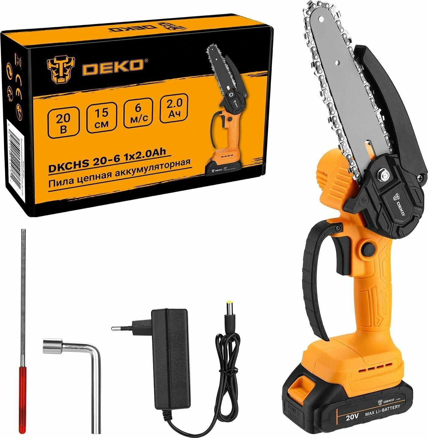 Battery 2 pcs., wrench 1 pc., charger 1 pc., file for sharpening chain 1 pc., screwdriver 1 pc., saw bar and chain included 1 pc.
