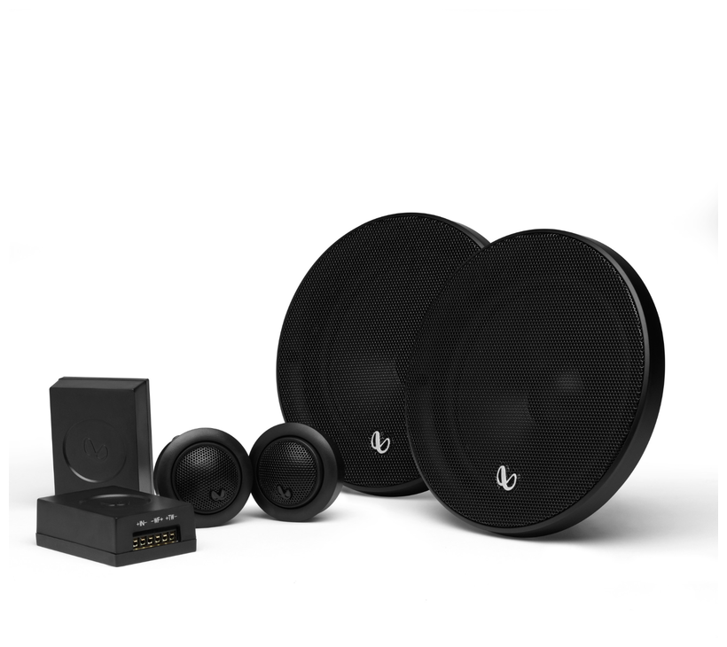 2 speakers, 2 grills, 8 bolts, 8 brackets, 2 crossovers, 2 tweeters, 2 Infinity logos