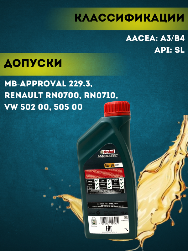 SAE viscosity grade: 5W-30, oil type: synthetic, fuel type: gasoline, diesel, GasolineDiesel, API standard: SL, SLCF, ACEA standard: A3/B4, B3A3B4, OEM approvals: MB 229.3, Renault RN 0700, Renault RN 0710, VW 502.00, VW 505.00, engine type: four-stroke