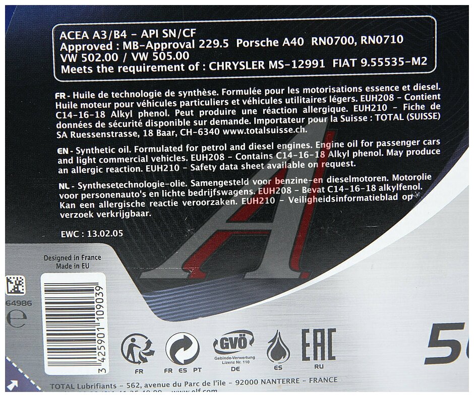 BMW Longlife-01, MB 229.3, MB 229.5, PORSCHE A40, VW 502.00/505.00, MB 229.51, MB 229.31, BMW LL-04, GM dexos2TM, Chrysler MS-11106, RN 0700