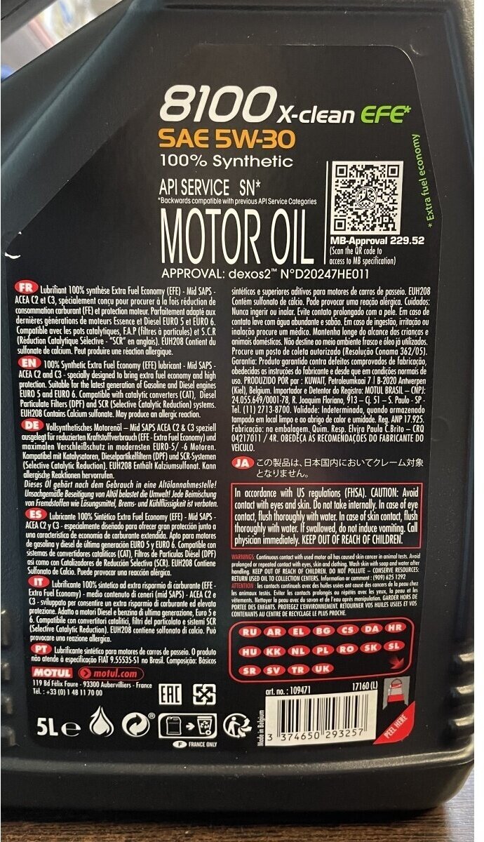 SAE Viscosity Grade: 5W-30, Oil Type: Synthetic, 100% Synthetic, OEM Approvals: 109471