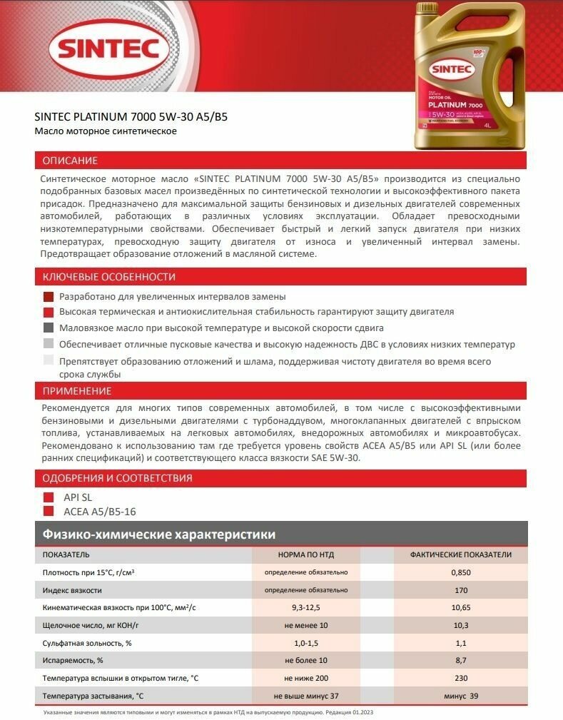 SAE viscosity grade: 5W-30, oil type: synthetic, fuel type: gasoline, diesel, API standard: SL, ACEA standard: A5/B5, A5/B5, engine type: four-stroke, four-stroke