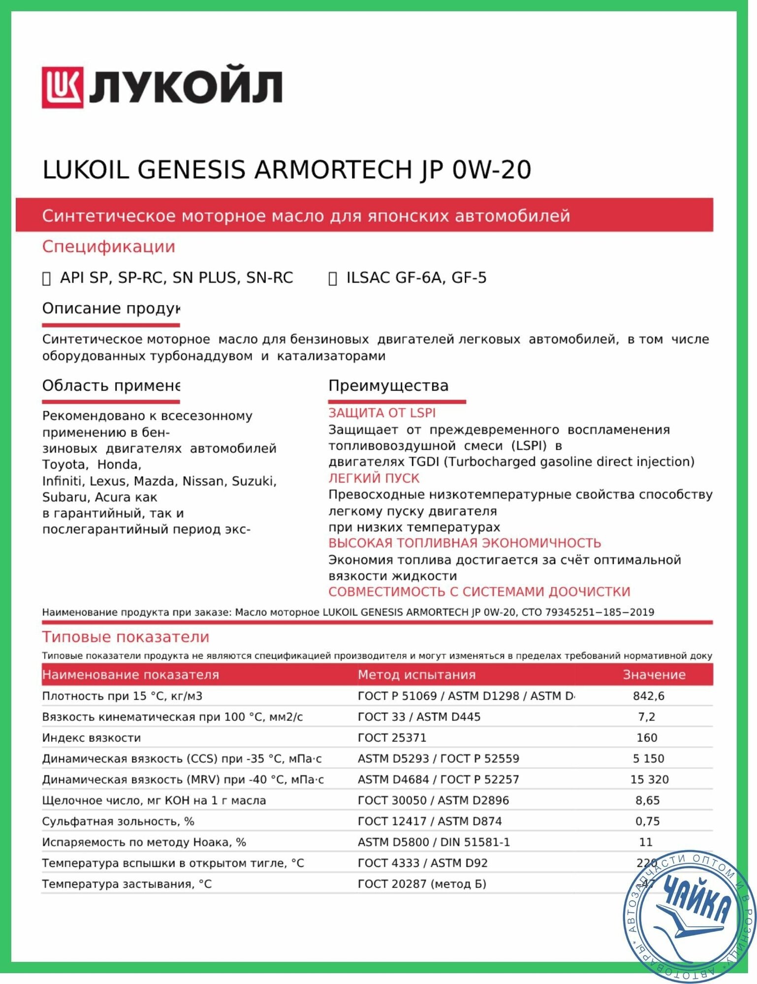 Synthetic engine, 3149925, Lukoil GENESIS ARMORTECH JP, 0W-20, SN/ILSAC GF-5 4l