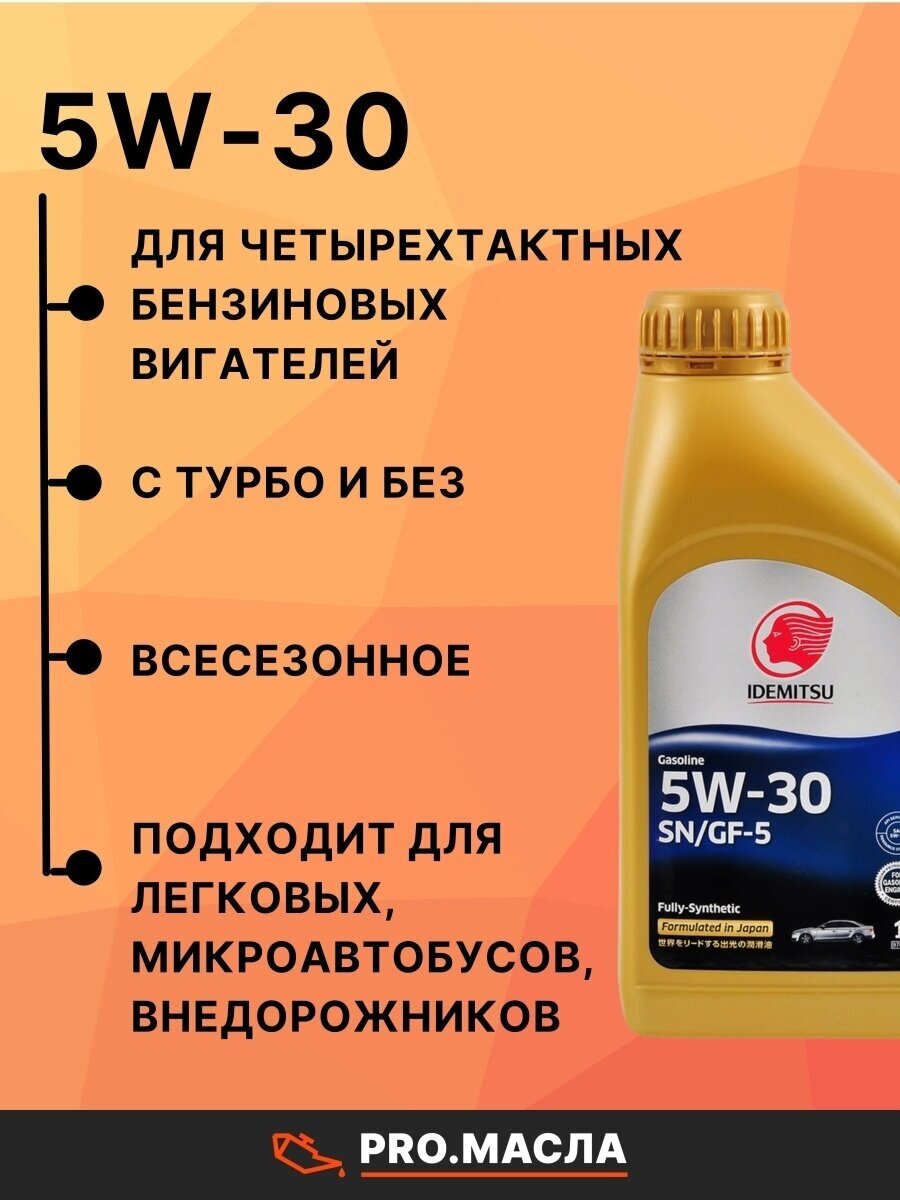SAE viscosity grade: 5W-30, oil type: synthetic, Synthetic, synthetic engine oil replacement, Synthetic all-season, fuel type: gasoline