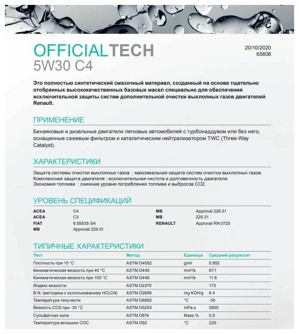 SAE viscosity grade: 5W-30, oil type: synthetic, fuel type: gasoline, diesel, ACEA standard: C3, C4, OEM approvals: MB 226.51, MB 229.31, MB 229.51, Fiat 9.55535, RN 0720