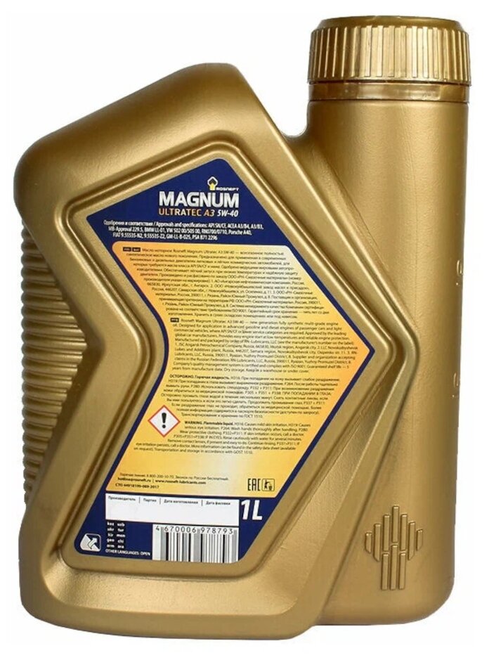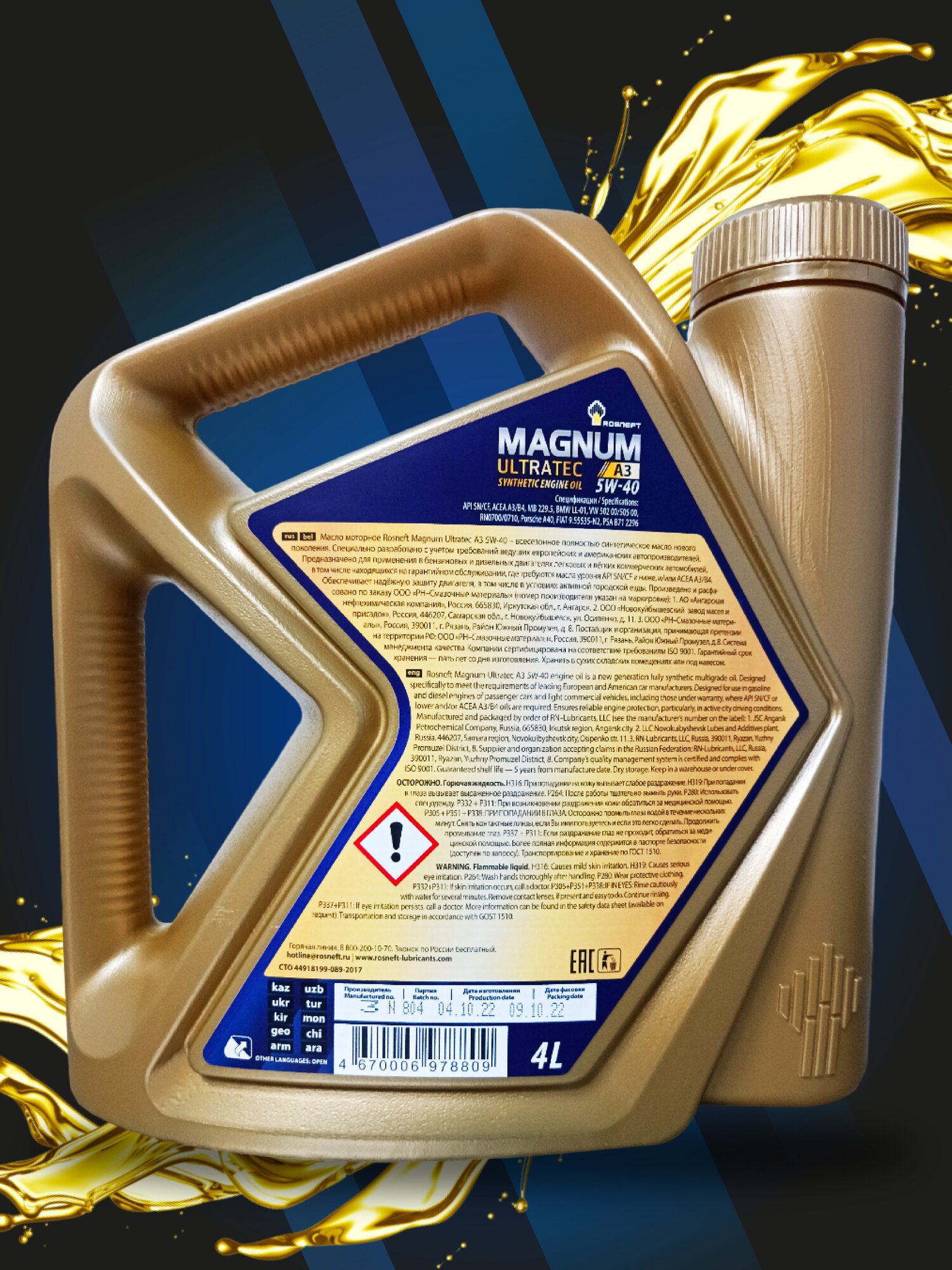 Rosneft Magnum Ultratec A3 5W-40 engine oil is intended for use in modern gasoline and diesel engines of passenger cars and light commercial vehicles, including those equipped with turbocharging, where necessary