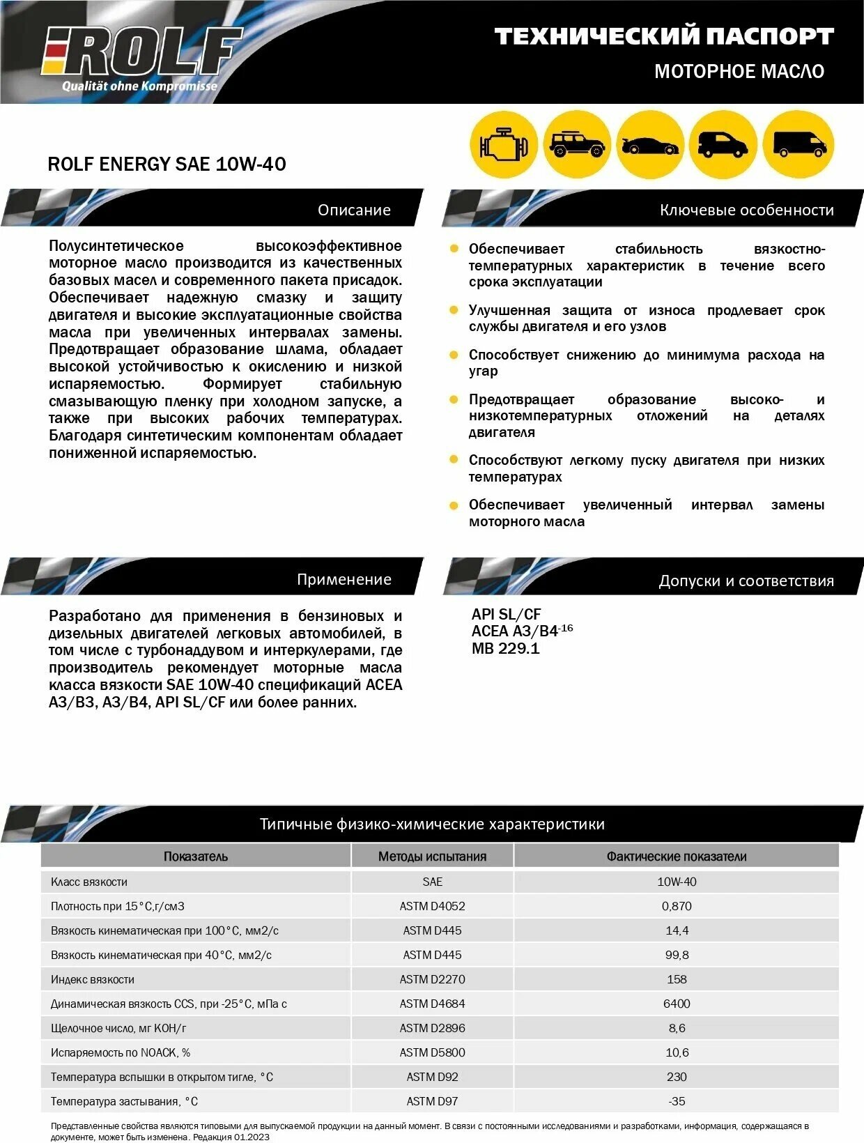 SAE viscosity grade: 10W-40, oil type: semi-synthetic, fuel type: gasoline, diesel, API standard: SL, CF, ACEA standard: A3/B4, OEM approvals: MB 229.1, engine type: four-stroke