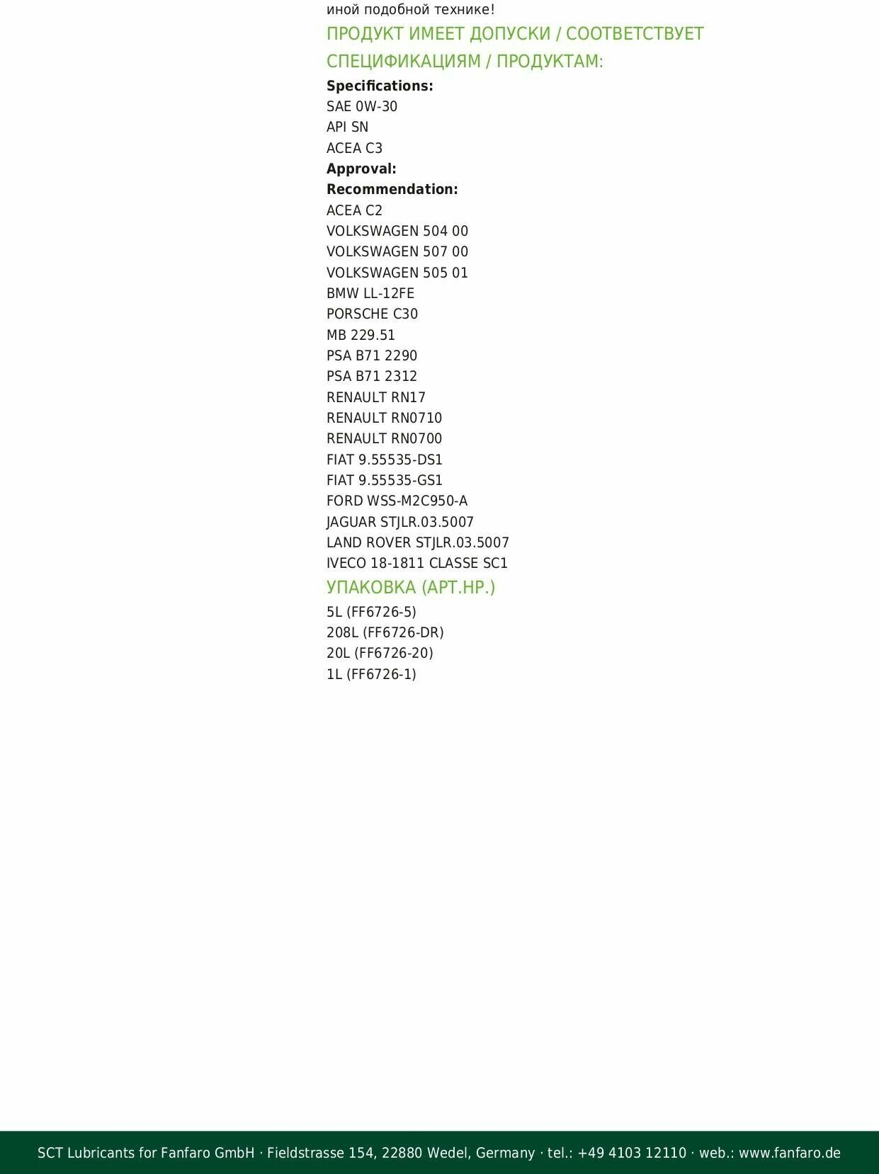 FIAT 9.55535-DS1, FIAT 9.55535-GS1, MB 229.51, PORSCHE C30, PSA B 71 2290, PSA B71 2312, Iveco 18-1811, RN 17, Renault 0700/0710, STJLR.03.5007, VW 504 00, VW 505 01, VW 507 00, WSS-M2C950-A