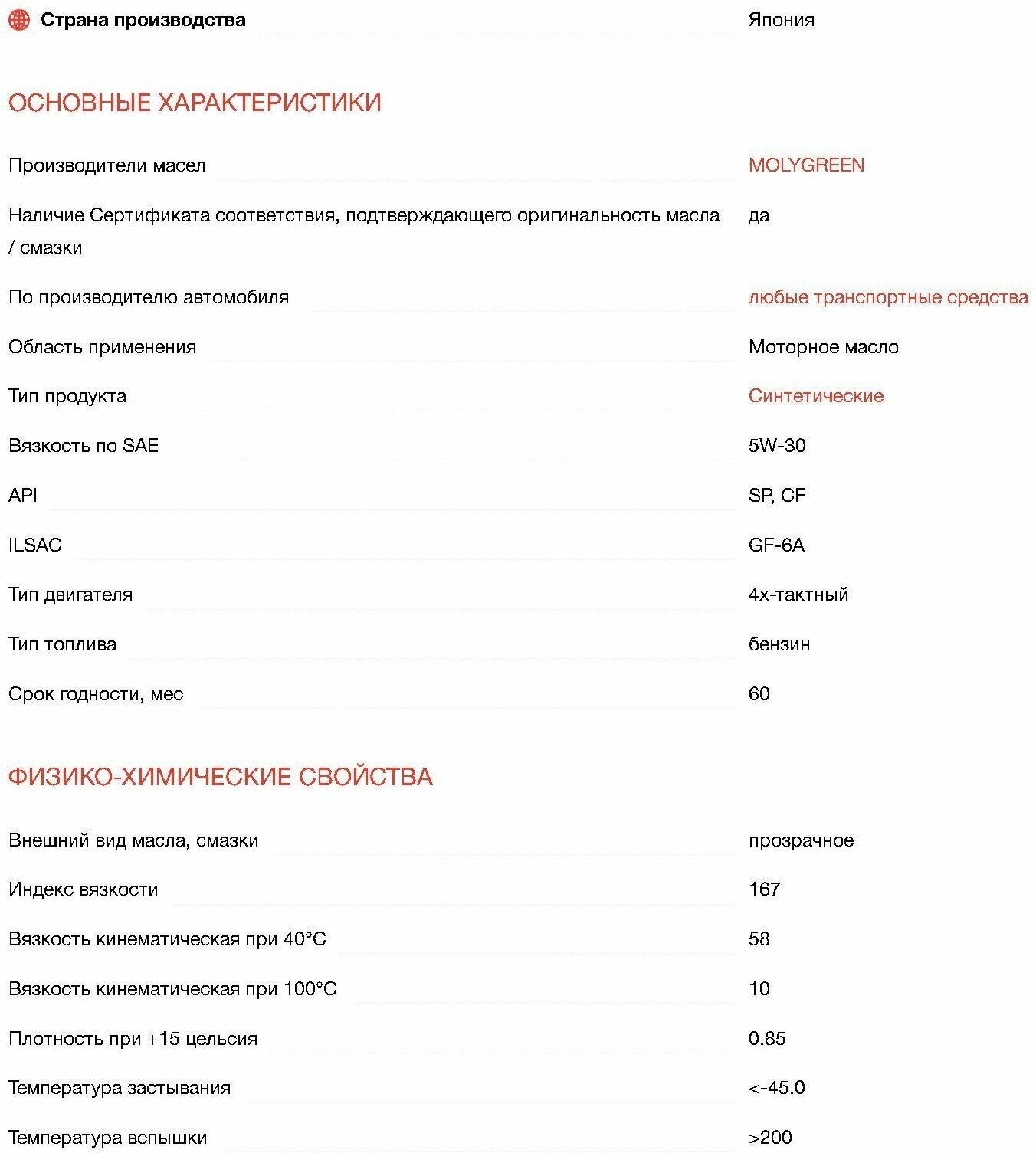 SAE viscosity grade: 5W-30, oil type: synthetic, fuel type: gasoline, API standard: CF, SP, engine type: four-stroke