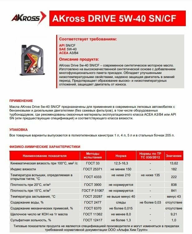 AKross DRIVE, synthetic, 5W-40, SN/CF, 5 l.