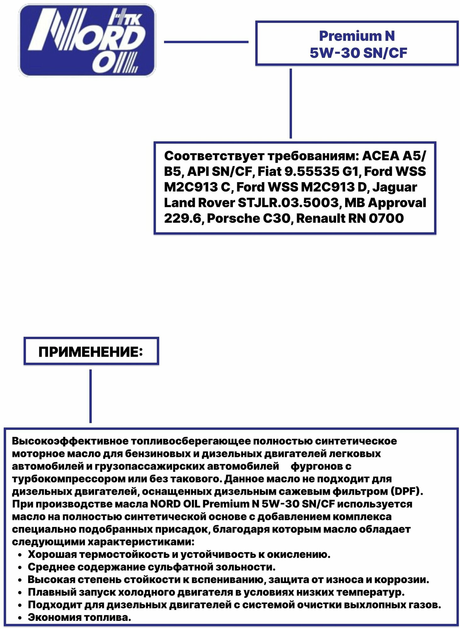 SAE viscosity grade: 5W-30, oil type: synthetic, fuel type: gasoline, diesel, API standard: CF, SN, ACEA standard: A5, B5, engine type: four-stroke