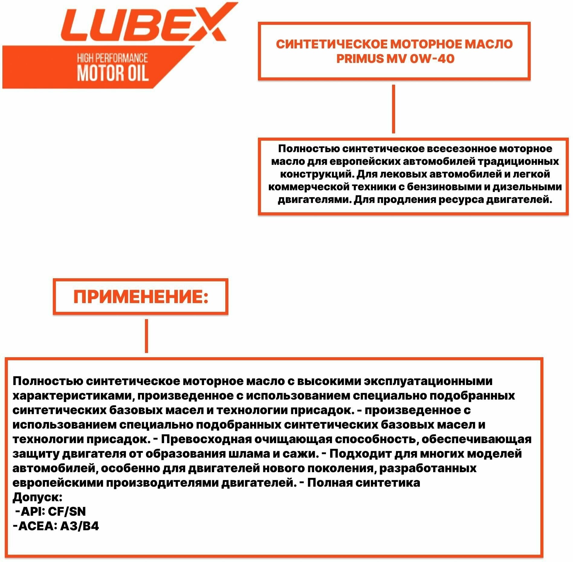 Synthetic Lubex Primus MV 0W-40 API SN A3/B4 1l