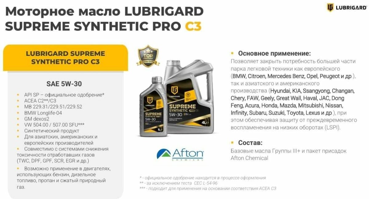 SAE viscosity grade: 5W-30, oil type: synthetic, fuel type: gasoline, diesel, propane, Gas, Hybrid, API standard: SN, SN+, SP, ACEA standard: C2, C3, C2, C3, OEM approvals: BMW Longlife-04, GM Dexos 2, MB 228.31, MB 228.51, MB 229.52, API SP; ACEA C2/C3;