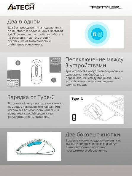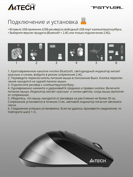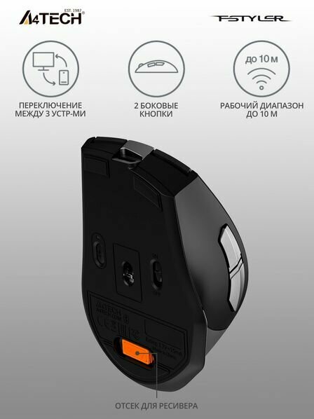 Equipment: Wireless mouse A4Tech Fstyler FB35C, nano USB receiver, USB Type-C cable, documentation