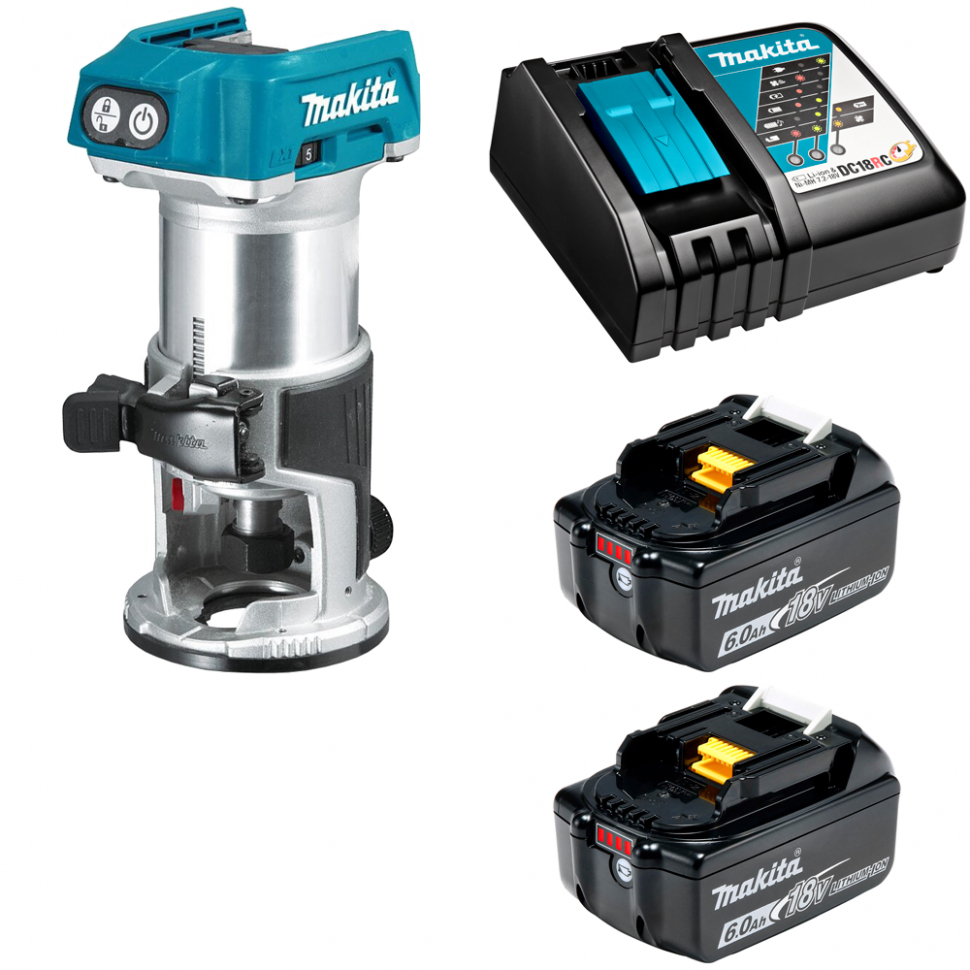 Equipment: Edge vertical base; Guide; Dust collector pipe; Copy sleeve 10; Collet clamp 8 mm; Wrenches 13/22; Battery 2pcs x 6Ah; salary; without case.