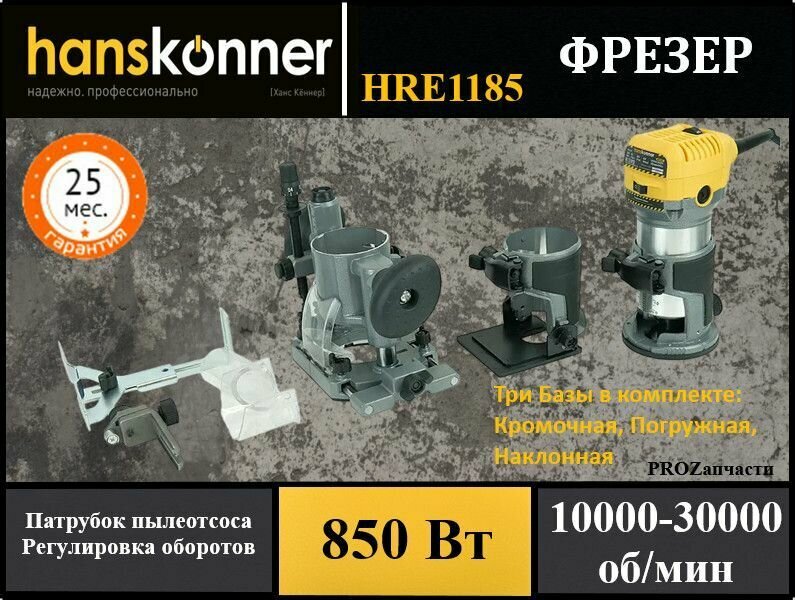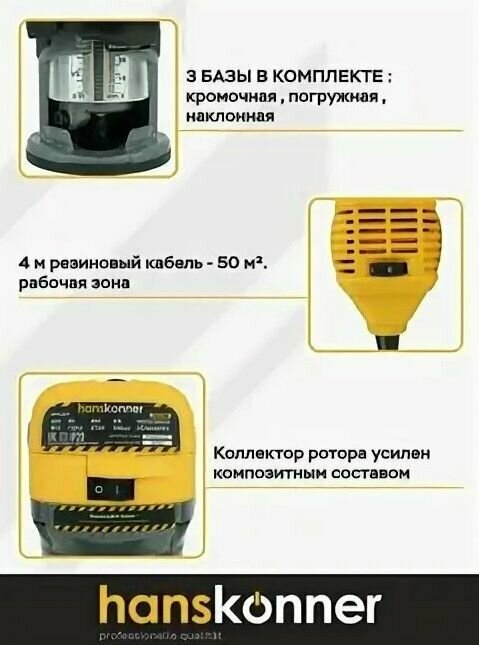 Router, key, carbon brushes 1 set, collet 8, collet 6 mm installed, rip fence, edge base, plunge base, inclined base, roller stop, dust removal adapter, instructions, bag