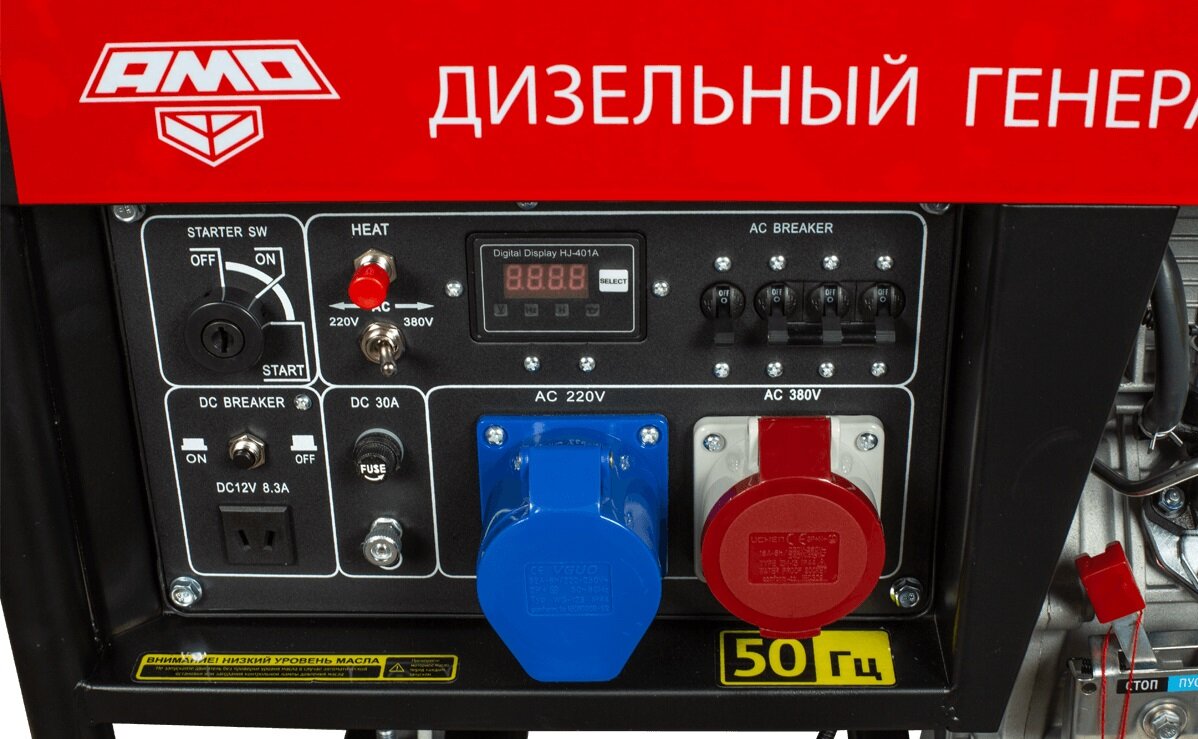 Type: diesel, rated power: 5500 W, maximum power: 6000 W, start: manual, electric, number of phases: 3, weight: 114 kg, cooling type: air, noise level: 97 dB, Number of 220 V sockets: 1, features: muffler, stake