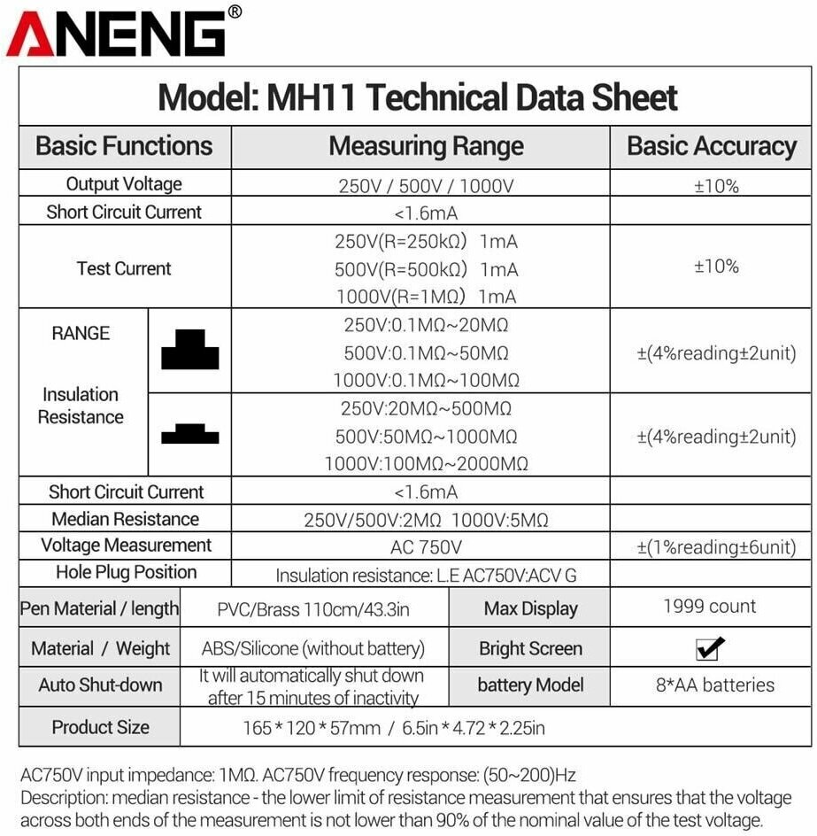 Insulation resistance meter megameter Aneng MH11, 0.1MOhm.2GOhm, 250.1000V