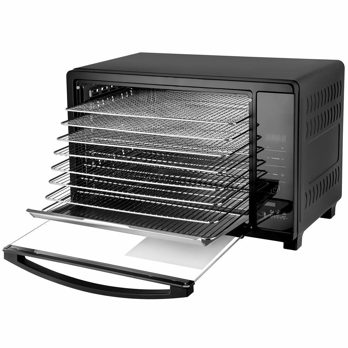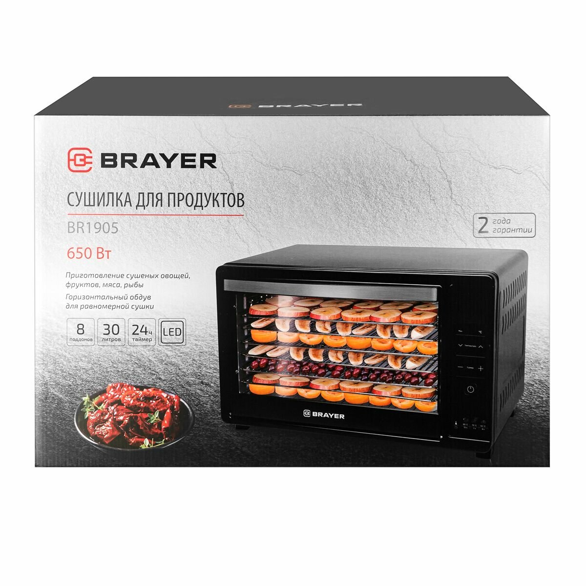 Type: convective, pallet material: metal, number of pallets: 8, power: 650 W, drying temperature adjustment, timer, control: electronic, features: display, overheat protection, power-on indication