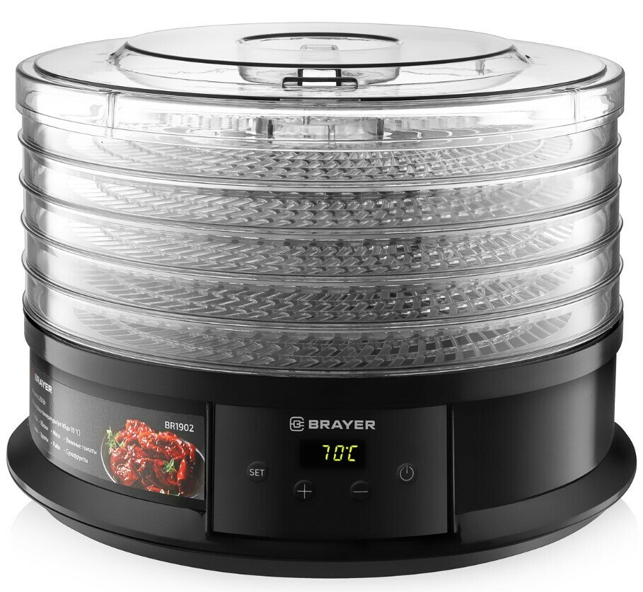 Type: convective, tray material: opaque plastic, number of trays: 5, power: 500 W, drying temperature control, timer, control: electronic, maximum load: 5 kg, features: display, protection against moisture