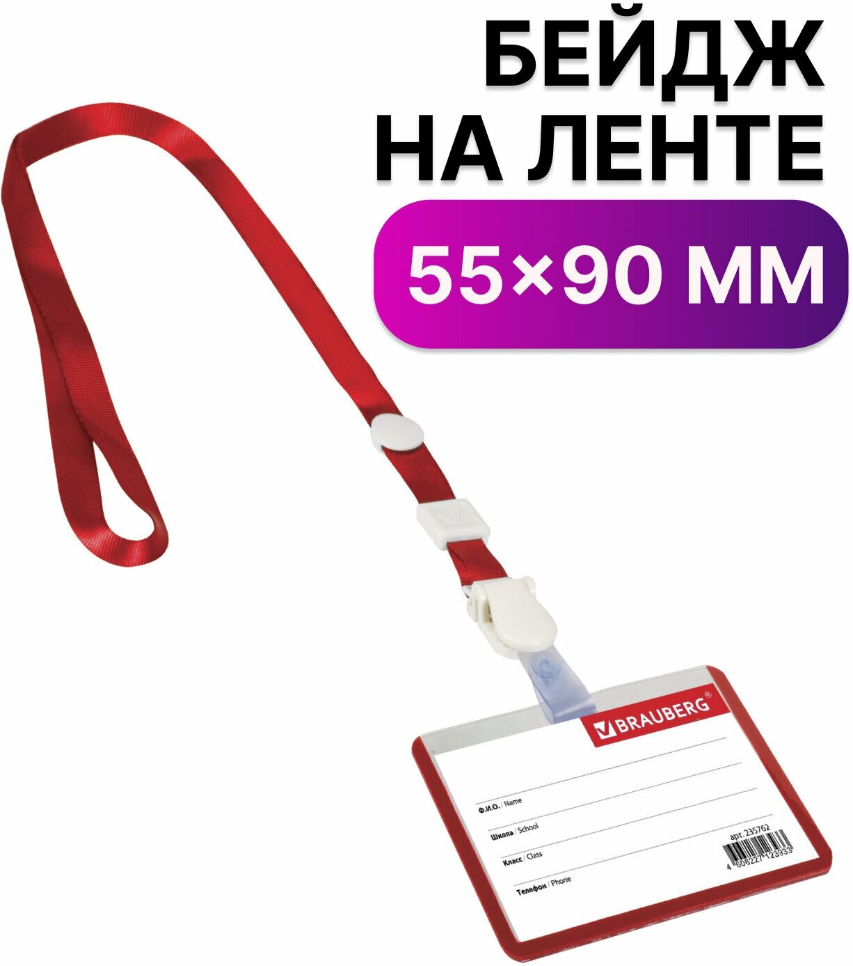 BRAUBERG Horizontal student badge 55x90 mm, on a ribbon with a removable clip, red, brauberg, 235762, 10 pcs.