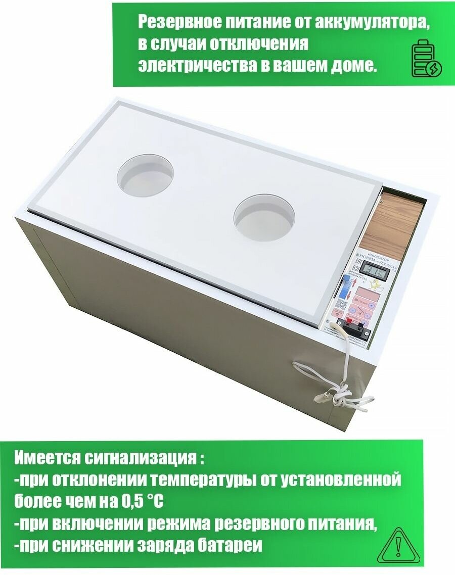 Turning: automatic, type of eggs: duck, features: automatic switching to emergency power, automatic humidity maintenance, auto-rotate trays