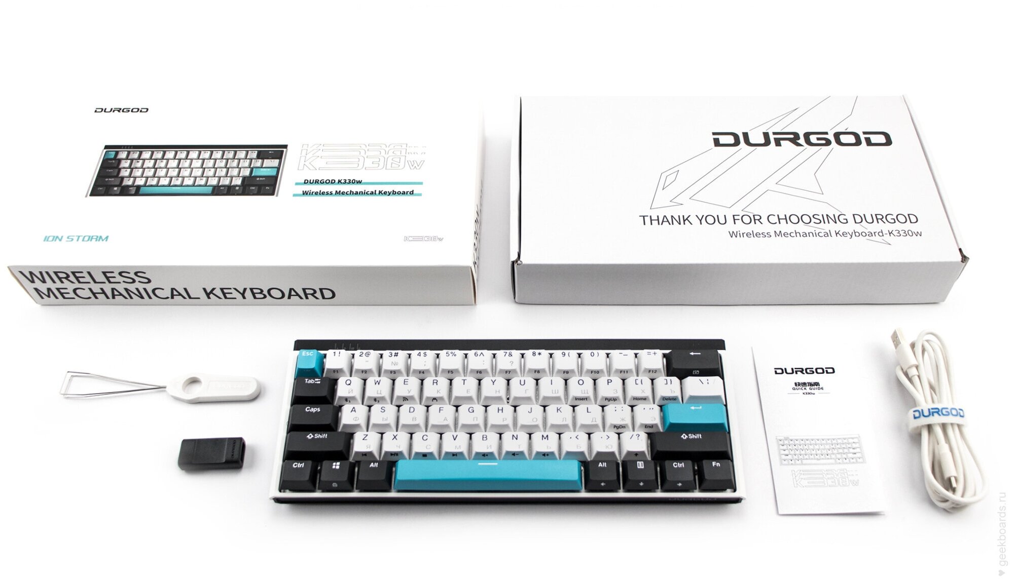 Keyboard; Box; Dust protection cover; Hardcap keycap remover – allows you to easily remove keys from the keyboard; The 2.4G USB adapter is hidden in the keyboard housing under the Durgod logo; Adapter USB Type-A input - USB Type-C input for connection
