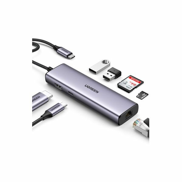 Converter UGREEN CM512 90568 USB-C to 2*USB3.0+HDMI+RJ45+SD+TF +PD Port Converter. Color: gray