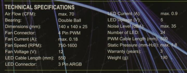 Type: fan, purpose: for case, fan diameter: 140, number of fans: 1, maximum noise level: 35 dB, connector type: 4-pin Molex, bearing type: hydrodynamic, maximum rotation speed: 1600
