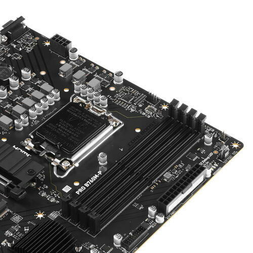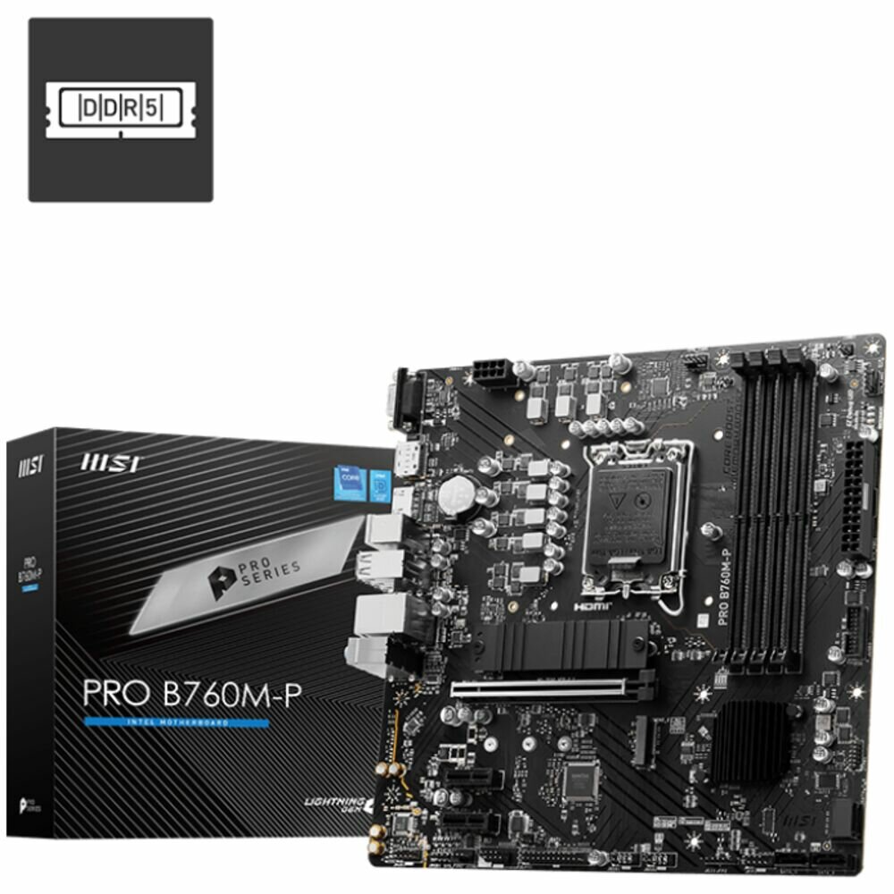 Socket: LGA1700, chipset name: Intel B760, form factor: microATX, processor manufacturer: Intel, memory type: DDR5 DIMM, number of memory slots: 5, number of M.2 slots: 2, number of PCI-E x16 slots: 1, Number of PCI-E x1 slots: 2, wireless