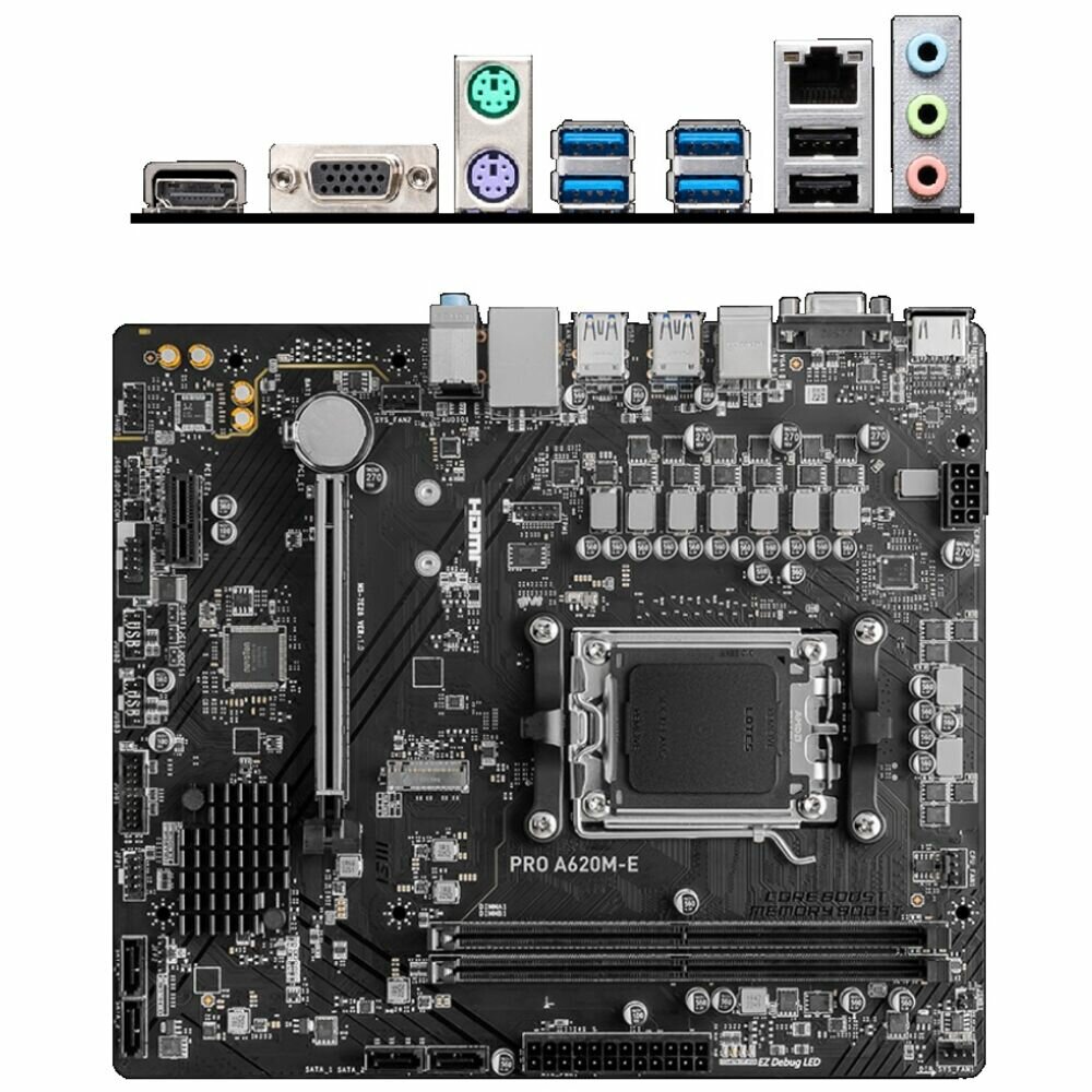 Socket: AM5, chipset name: AMD A620, form factor: microATX, processor manufacturer: AMD, memory type: DDR5 DIMM, number of memory slots: 2, number of M.2 slots: 1, number of PCI-E x16 slots: 1, Number of PCI-E x1 slots: 1, wireless inte