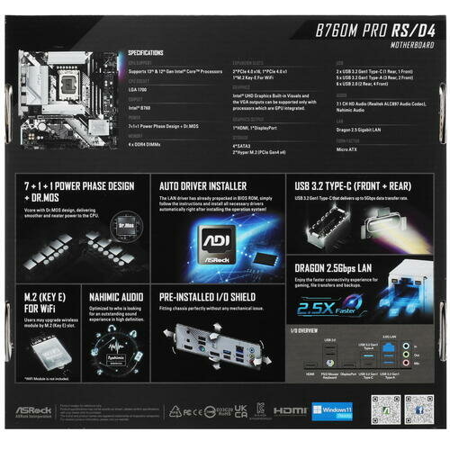 Socket: LGA1700, chipset name: Intel B760, form factor: microATX, processor manufacturer: Intel, memory type: DDR4 DIMM, number of memory slots: 4, number of M.2 slots: 2, number of PCI-E x16 slots: 2, Number of PCI-E x1 slots: 1, maximum