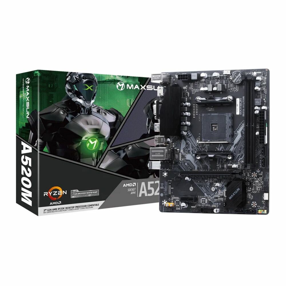 Socket: AM4, chipset name: AMD A520, form factor: microATX, processor manufacturer: AMD, memory type: DDR4 DIMM, number of memory slots: 2, number of M.2 slots: 1, number of PCI-E x16 slots: 1, Number of PCI-E x1 slots: 1, maximum frequency